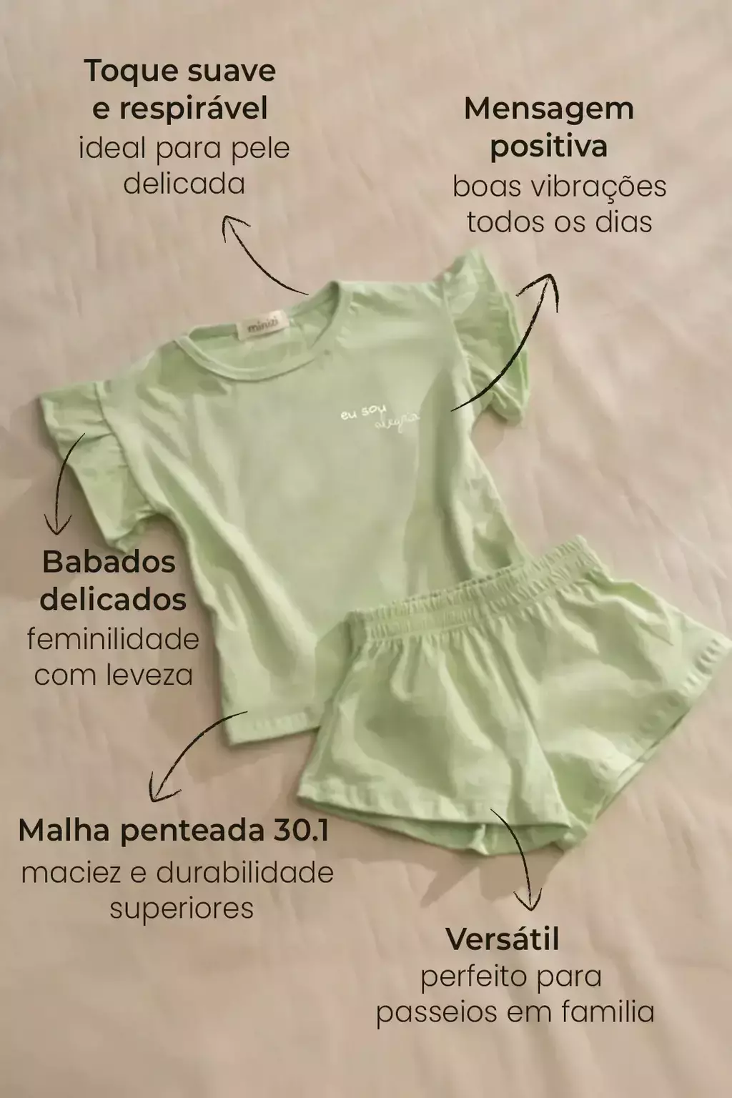 Esse conjunto foi criado para transmitir todo o cuidado que existe nos detalhes — desde o toque suave da malha até os babadinhos que trazem charme e feminilidade sem exagero. Com modelagem confortável e uma estampa que irradia positividade, essa peça celebra os pequenos momentos do dia a dia com beleza e significado.